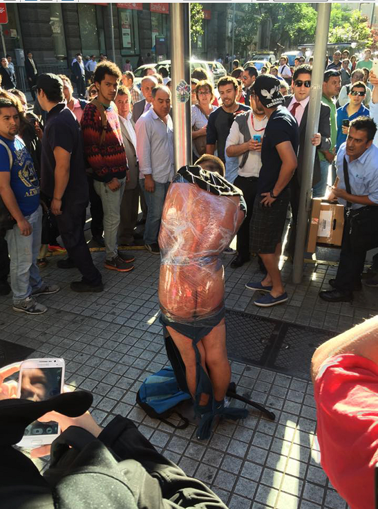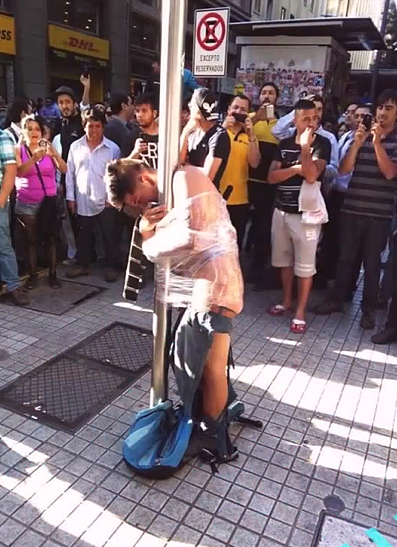 Τότε, το οργισμένο πλήθος τον έπιασε, τον έγδυσε και τον έδεσε με πλαστικό νάιλον σε έναν στύλο την ώρα που ο ήλιος έκαιγε, με το θερμόμετρο αυτή την περίοδο να δείχνει στην πρωτεύουσα της Χιλής τους 27 βαθμούς Κελσίου υπό σκιά.