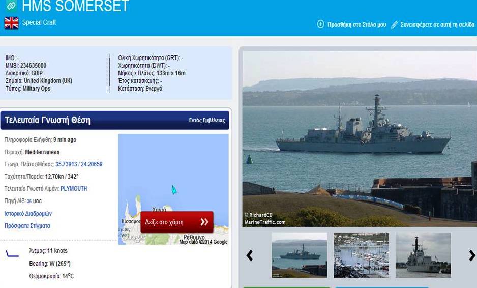 Στις 25/1/2014 μια ΒΡΕΤΑΝΙΚΗ ΦΡΕΓΑΤΑ με όνομα HMS SOMERSET και κωδικό F-82 βρισκόταν στην ναυτική βάση της ΣΟΥΔΑΣ και μπαινοέβγαινε σε αυτήν.