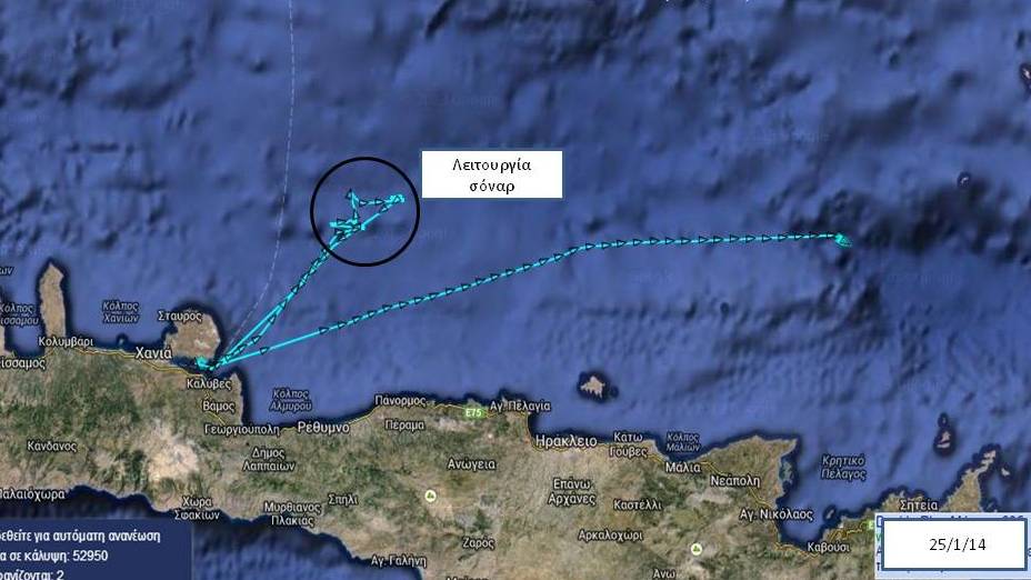 Αρχικά τις πρωινές ώρες 25/1/2014 πήγε βορειοδυτικά των ΧΑΝΙΩΝ και αφού μπήκε στην ΣΟΥΔΑ ξαναβγήκε το απόγευμα άμεσα και πήγε βόρεια της ΣΟΥΔΑΣ.