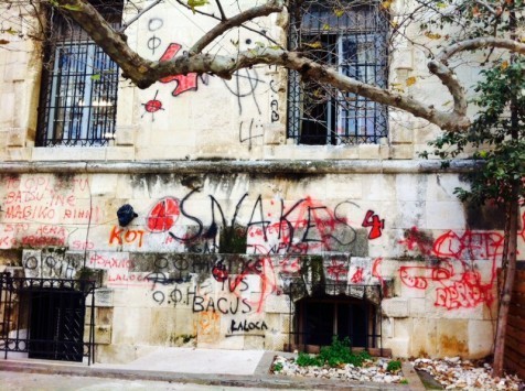 Βαμμένοι με ανεξίτηλο μαρκαδόρο και με σπρέι χρώματος όλες σχεδόν οι κολόνες στην είσοδο, οι τοίχοι, καθώς και οι ξύλινες πόρτες του κτηρίου. Γραφές, δυστυχώς, νέων ανθρώπων που συχνάζουν εκεί, θέλοντας και εκείνοι με αυτό το τρόπο να αφήσουν το "σημάδι" τους κατά κάποιο τρόπο σε αυτή εδώ την πλάση...