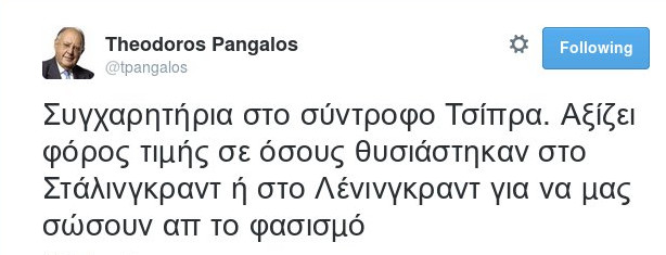 Σε ανάρτησή του στον προσωπικό του λογαριασμό στο Twitter, ο Θ. Πάγκαλος έγραψε: