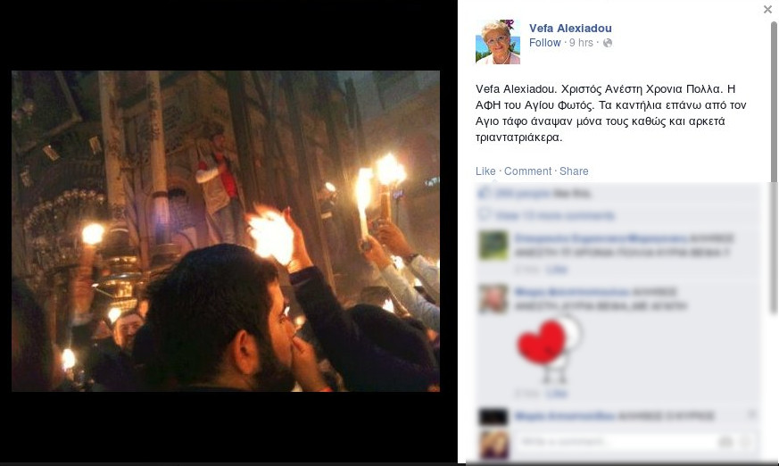 Η ίδια ανέβασε στο προσωπικό της προφίλ στo Facebook και τις αντίστοιχες φωτογραφίες από την τελετή Αφής του Αγίου Φωτός.